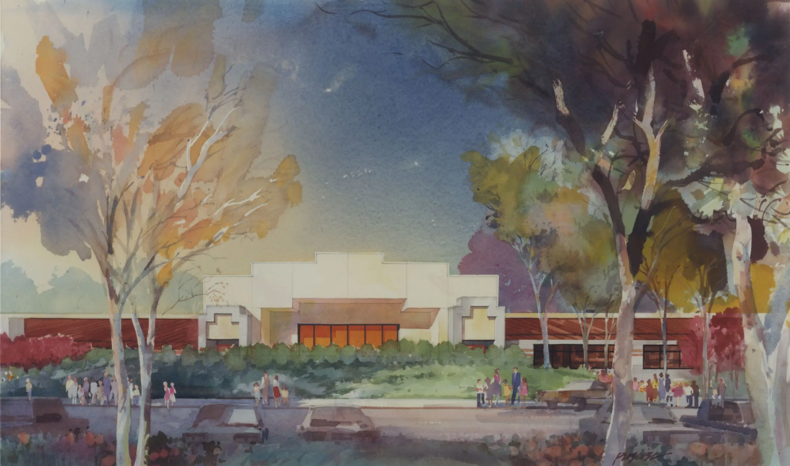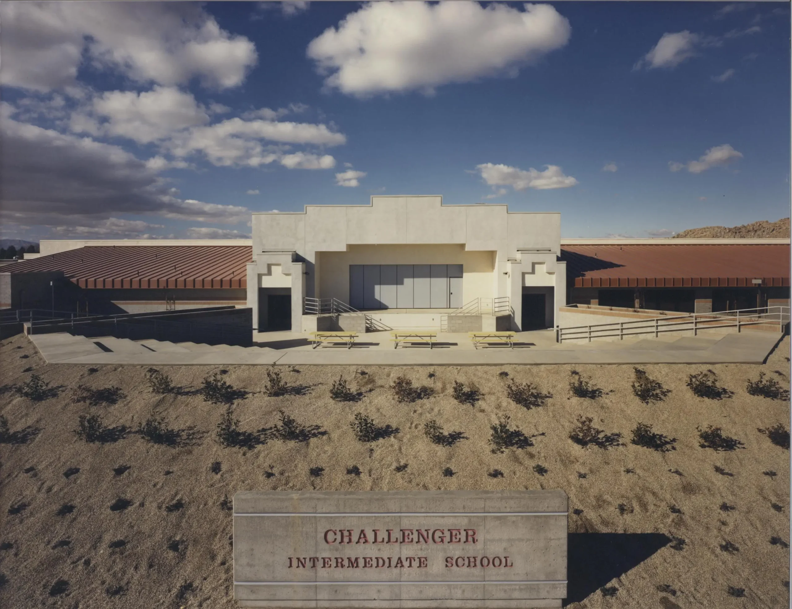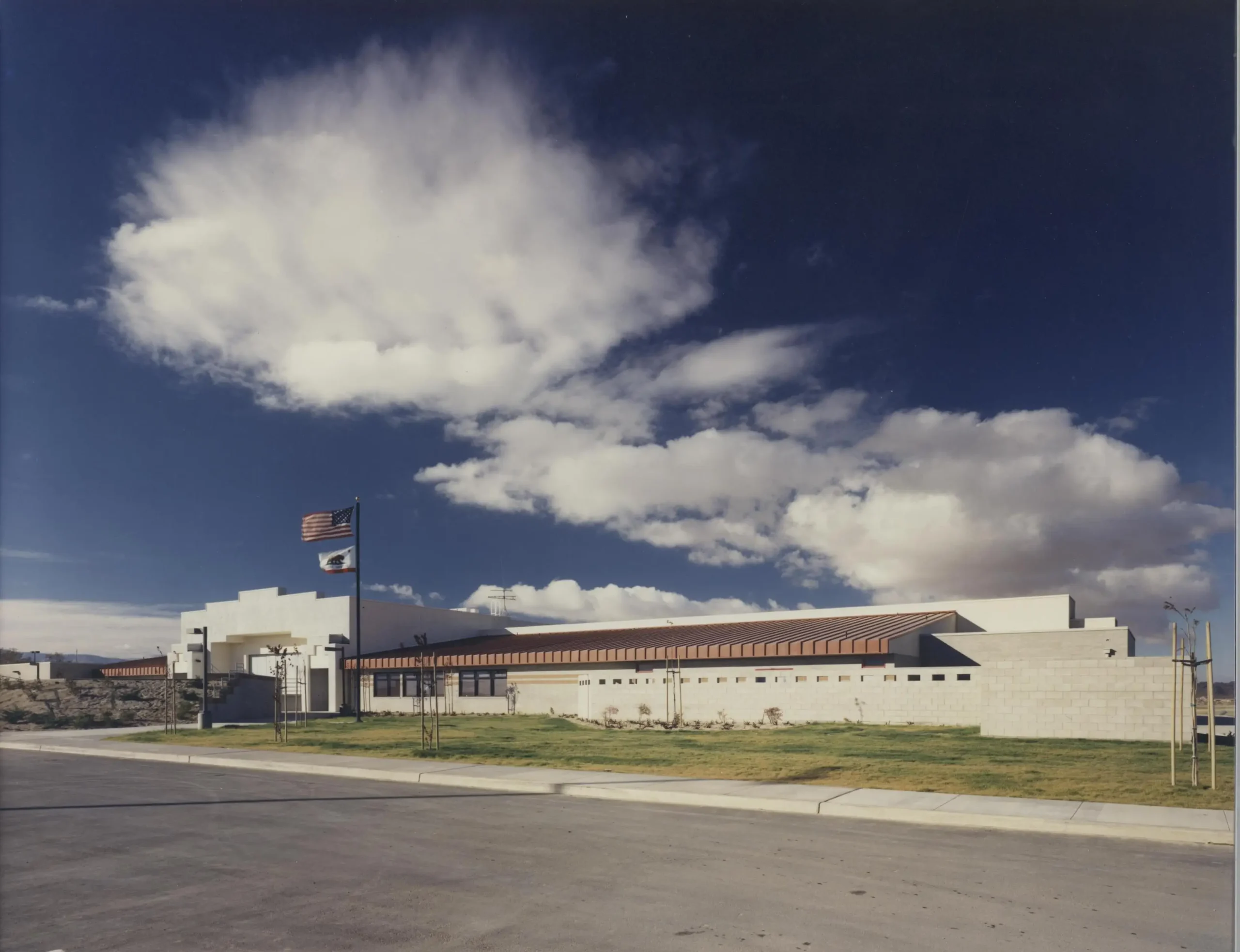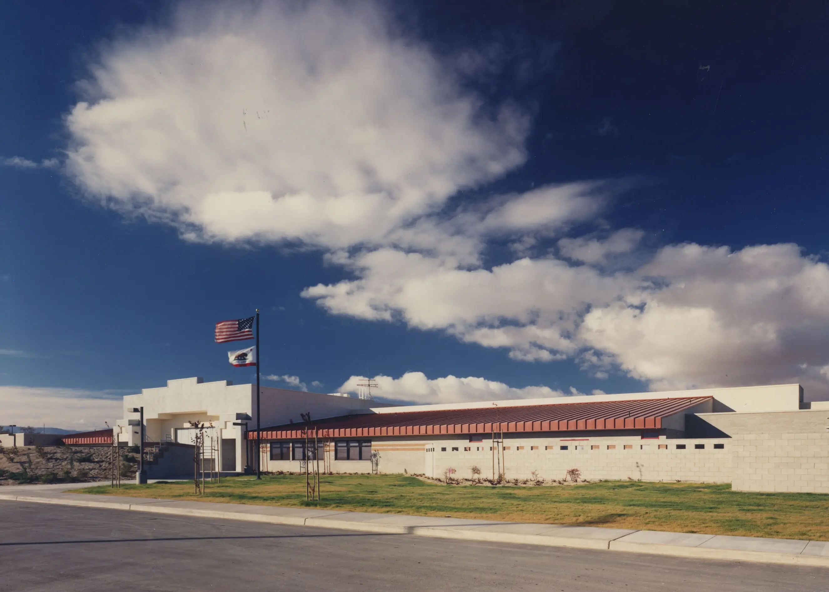 Flewelling & Moody provided full architectural and engineering services for this one-story stucco and masonry veneer school. The 39,000 SF facility includes 15 classrooms, science lab, shops, library, multipurpose room with a stage, central kitchen, and administration offices. It features vaulted skylights to brighten corridors to each of the four wings of the facility, is sheathed in exterior plaster, and has a standing seam metal roof. The building sits on a site of more than twenty acres and includes a running track and little league baseball diamonds.