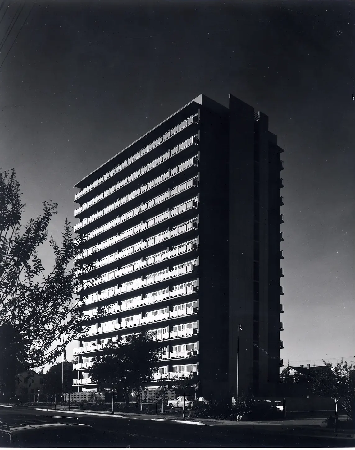 At time of construction the Concord Apartments tower was Pasadena’s tallest high-rise. It was built as affordable senior housing. Constructed of concrete, the 14-story, 150 unit structure accommodates more than 200 people and was designed to reflect a contemporary motif. Each unit has a built-in kitchen and outdoor patio balcony. There are community areas as well as on-site recreation and laundry facilities.